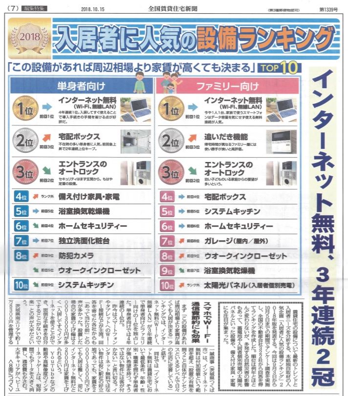 賃貸物件における入居者に人気の設備ランキング2018年度(全国賃貸住宅新聞調べ)をご紹介します。