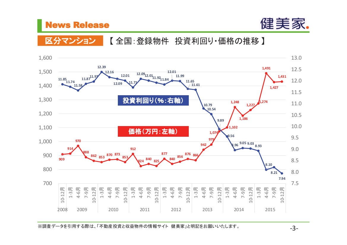 これは要するに不動産価格の上昇に対して家賃相場が変動していないため、利回りが低下して収益性が悪化しているということです。